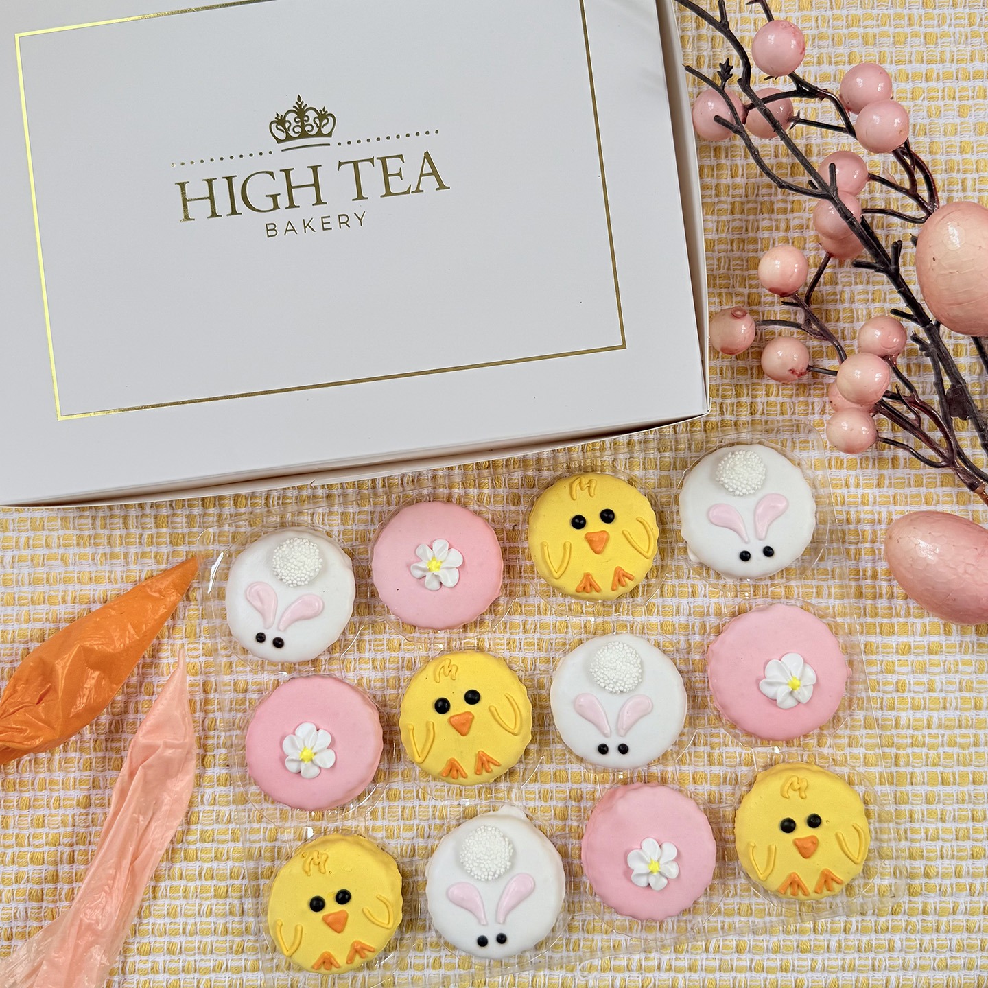 Pricing is per dozen, and each dozen will include 4 white bunnies, 4 yellow chicks, and 4 daisies. These come packaged in our classic white bakery boxes with the gold logo. (The keepsake gift boxes are sold as a separate product.)