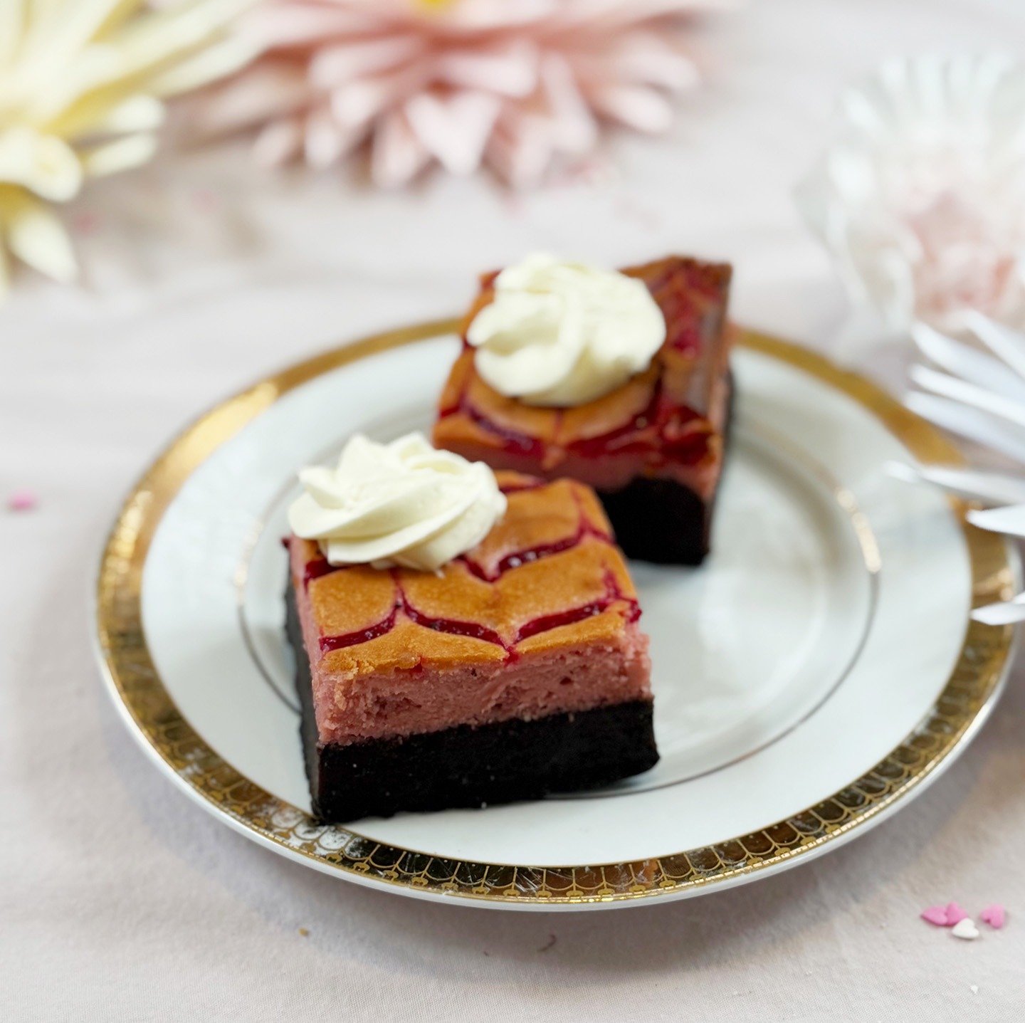 BACK FOR YEAR 2!! A delicious base of fudgy chocolate brownie, topped with sweet and creamy raspberry cheesecake (made with real raspberry puree!), and decorated elegantly on top with a beautiful swirl pattern. Finished off with a dollop of fresh whipped cream and you have a dessert that is sure to induce cravings for days to come!